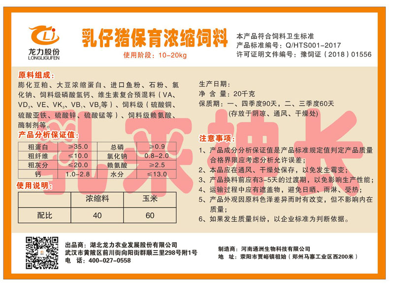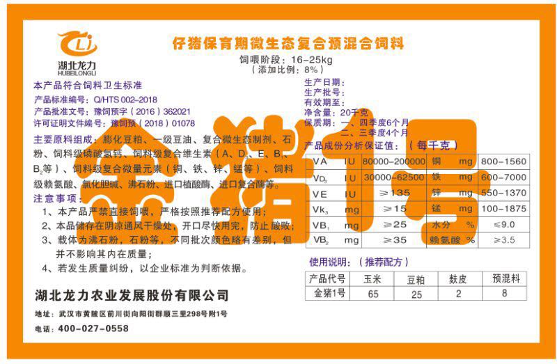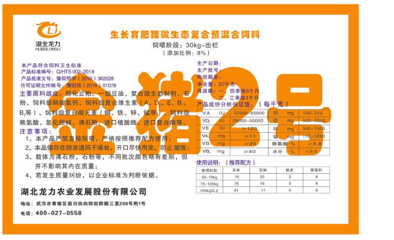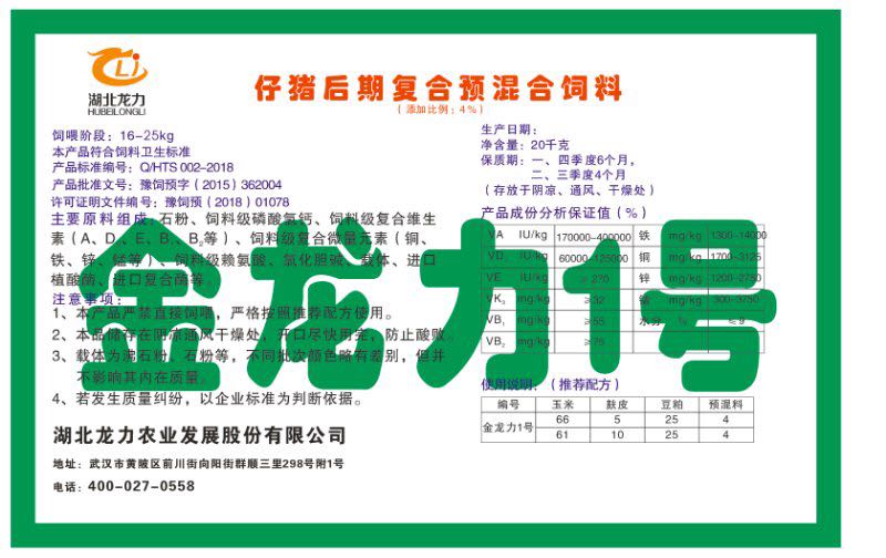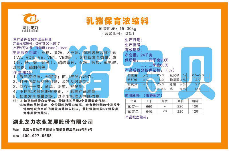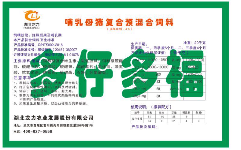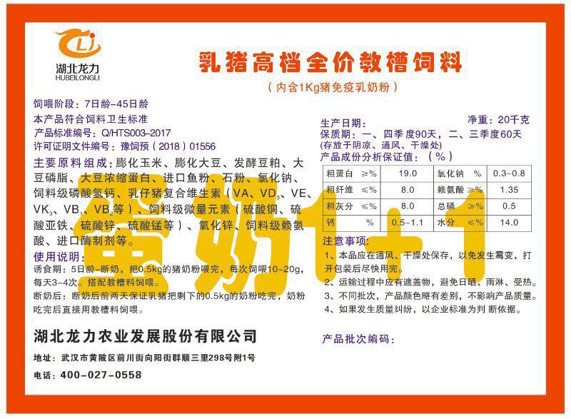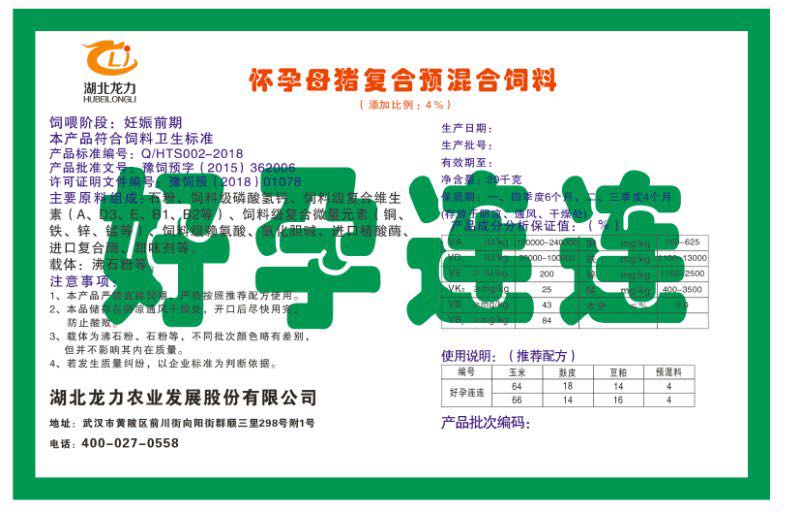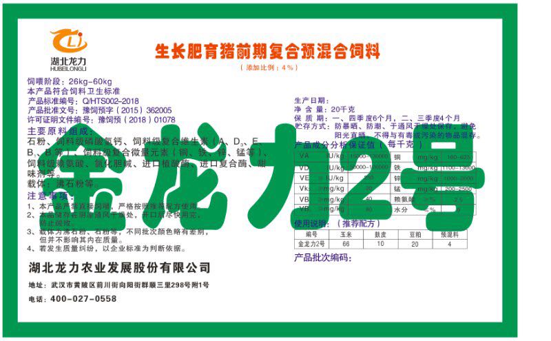 湖北龍力農(nóng)業(yè)發(fā)展股份有限公司坐落于武漢市黃陂區(qū)前川街向陽街群順三里298號附1號。公司成立于2014年6月,公司自成立以來把“創(chuàng)全球最大養(yǎng)豬綜合服務”為企業(yè)愿景。致力于打造教保料品牌”作為公司發(fā)展的明確目標。公司一直致力于豬營養(yǎng)的研究和開發(fā),積極與國內(nèi)外高校和科研機構(gòu)合作,推廣養(yǎng)豬技術(shù)、動物營養(yǎng)新概念,向世界農(nóng)牧企業(yè)學習與合作。公司采用國內(nèi)先進的生產(chǎn)工藝,選擇高精度電子配料秤,高均勻度、無殘留混合機等先進設(shè)備....